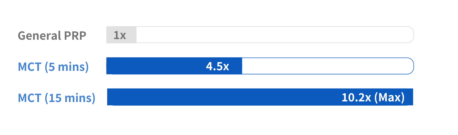 Dank MCT können Sie eine mehr als dreifach stärkere regenerative Wirkung erwarten als bei herkömmlichen PRP- oder Stammzellbehandlungen. Höhere Mengen an Exosomen und Wachstumsfaktoren fördern die Geweberegeneration bei Verfahren, in denen MCT eingesetzt wird, deutlich.