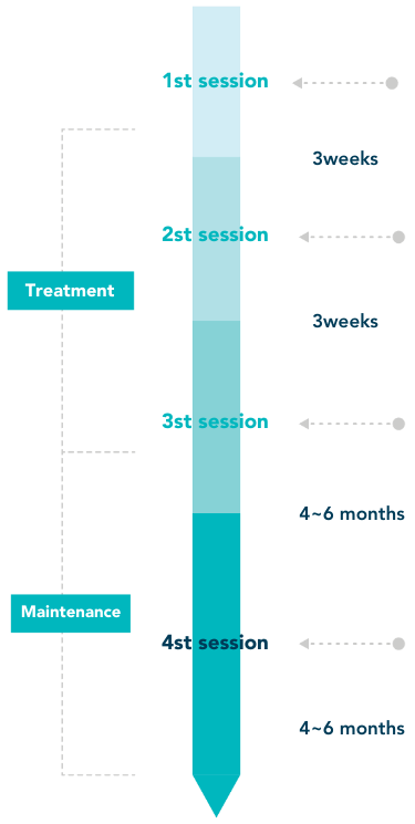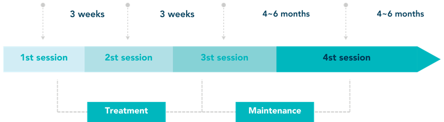 Für optimale regenerative Ergebnisse wird am häufigsten ein Protokoll mit drei Sitzungen im Abstand von jeweils drei Wochen empfohlen; der individuelle Behandlungsplan wird jedoch im Gespräch mit Ihrer Ärztin bzw. Ihrem Arztfestgelegt und kann je nach Ausprägung Ihres Anliegens und Ihrem Behandlungsziel variieren.